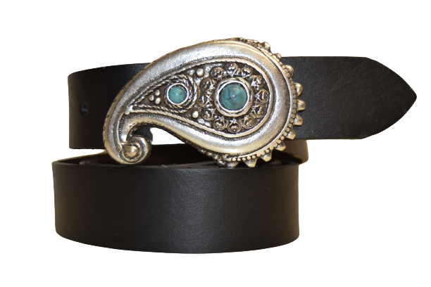 Cintura artigianale con altezza di 4 cm in vero cuoio e fibbia color Argento vecchio e pietre turchesi