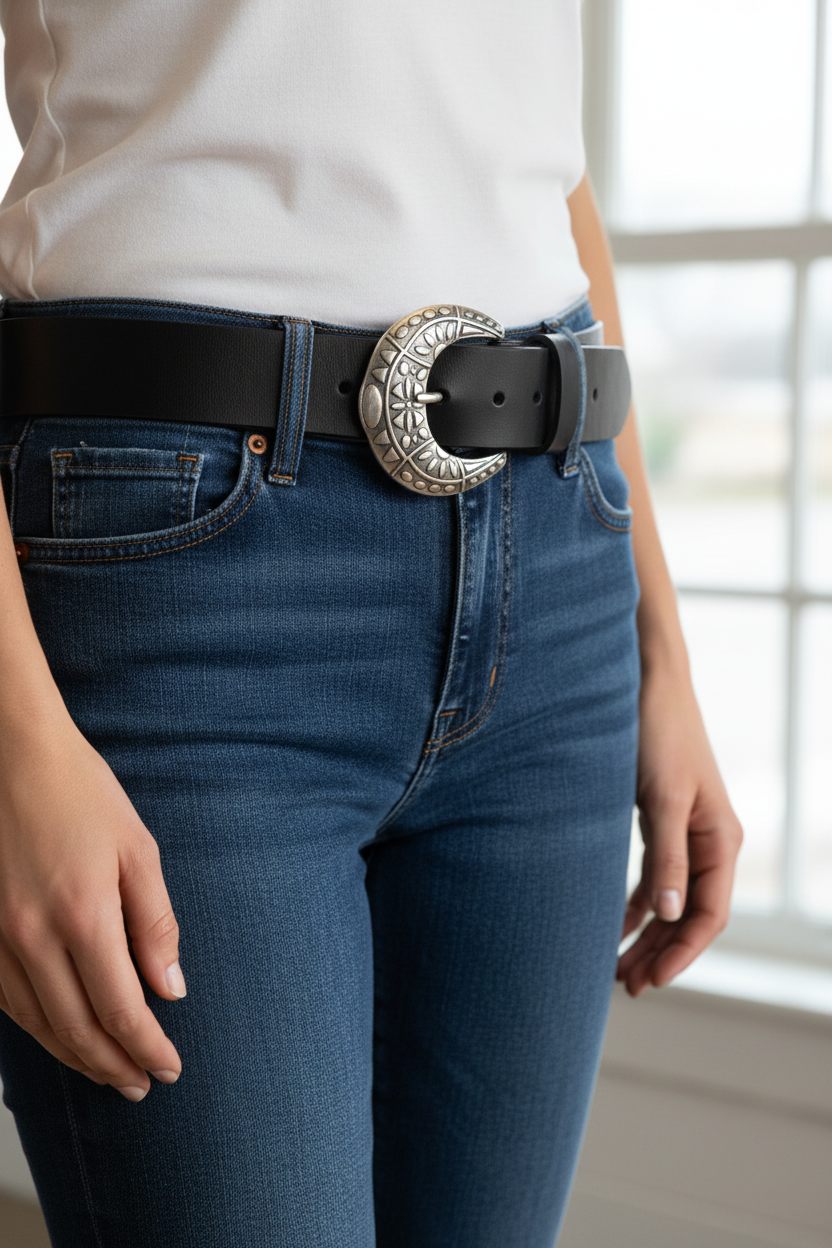Il pezzo forte è la fibbia argentata a forma di mezzaluna, finemente decorata con motivi floreali e geometrici a rilievo. È un design unisex che sta bene a tutti: perfetto per dare un tocco di personalità ai jeans o per arricchire un pantalone più elegante con un dettaglio artistico.